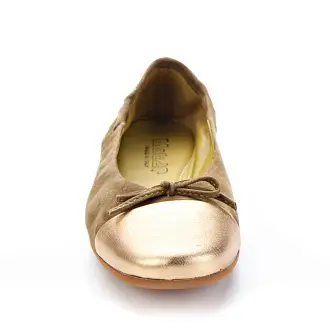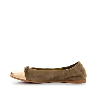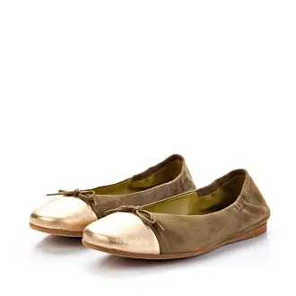 Женские балетки из натуральной кожи зеленого оттенка украшены золотистой кожаной вставкой на закругленном мысу и кокетливым бантиком.