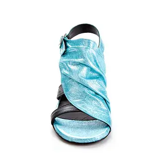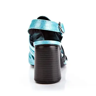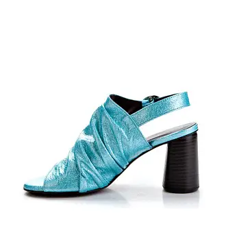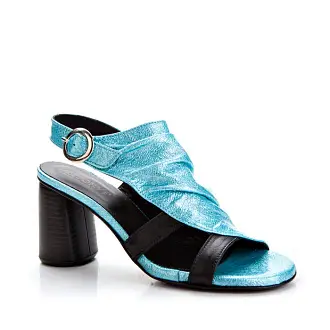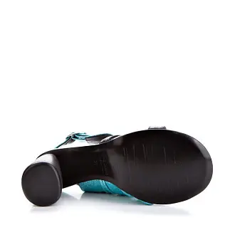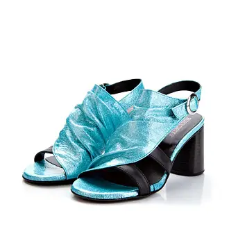 Модные босоножки итальянского производства - идеальная летняя обувь. Модель на высоком устойчивом каблуке. Открытые боковые части и мыс создают необходимую в жаркую погоду вентиляцию. Сочетание голубого и черного, а также металлические заклепки сделали дизайн запоминающимся.