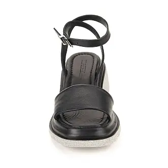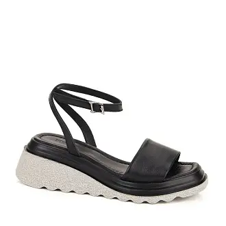 Стильные босоножки из натуральной кожи черного цвета. Модель выполнена в лаконичном дизайне основу которого составляют союзка и тонкий ремешок с пряжкой на щиколотке. Модель на высокой подошве из полимерного материала. Она имеет небольшой наклон, который придает стопе комфортное положение.