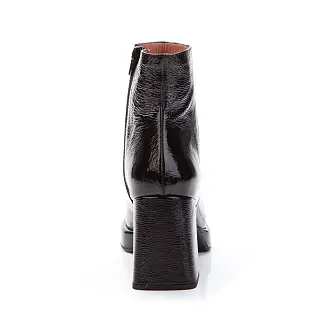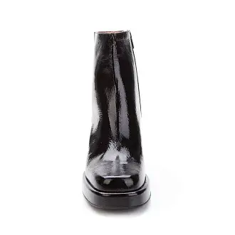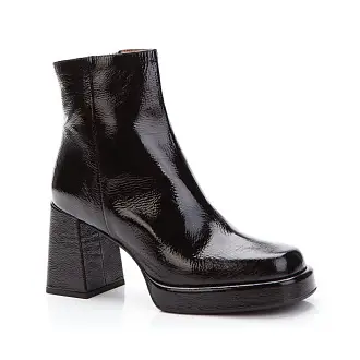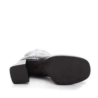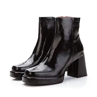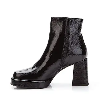 Демисезонные женские ботинки итальянского производства изготовлены из натуральной лакированной кожи. Модель с закруглённой формой мыса и голенищем средней высоты. Акцентным украшением дизайна стал высокий прямоугольный фактурный каблук.