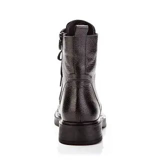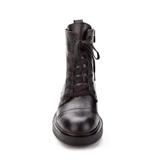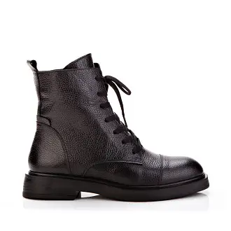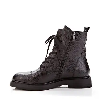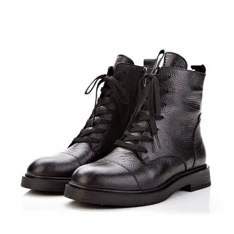 Ботинки на шнуровке из натуральной черной кожи напоминают армейские. Модель женская и, в отличие от мужского варианта, готова поддержать любой образ. Вполне допустимо появиться в подобных ботинках и в театре, и  в кафе, и в походе. Везде будет комфортно, уютно и тепло. За тепло, кстати, отвечает натуральный мех, который разместился внутри обуви. Кстати, шнуровку можно полноценно использовать, затягивая обувь точно по ноге, а можно оставить в качестве декоративного элемента, поскольку модель оснащена и молнией.