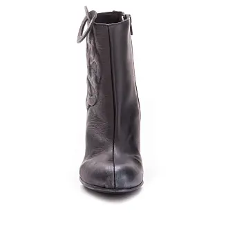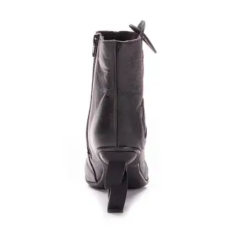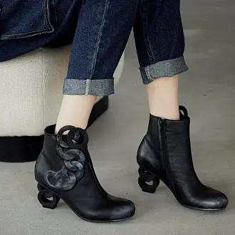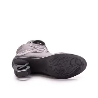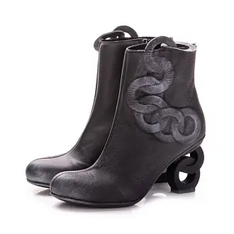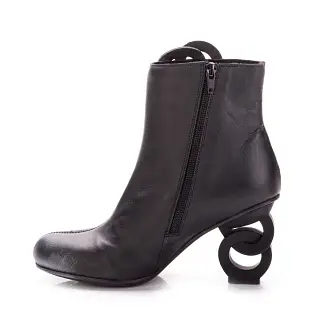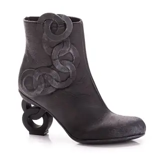 Необычная форма каблука, которая продолжает дизайн на голенище, выглядит современно и необычно.