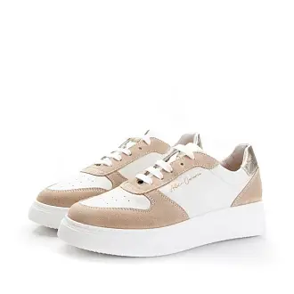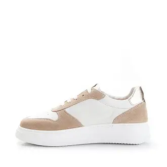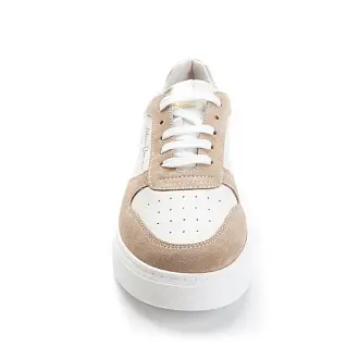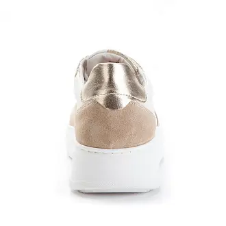 Модные женские кеды изготовлены из натуральной замши и кожи. Гармоничное сочетание бежевого и белого оттенков сделало дизайн элегантным.