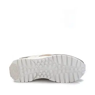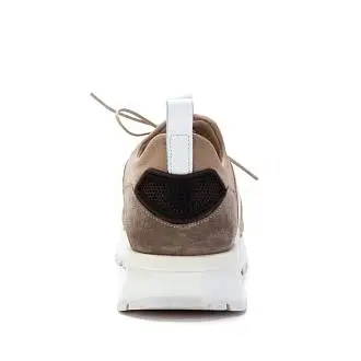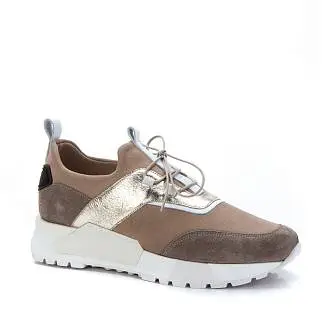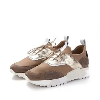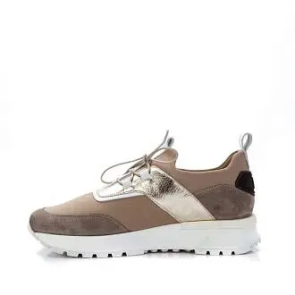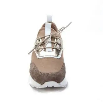 Модные женские кроссовки из натуральной кожи, замши и текстиля выполнены в базовом бежевом оттенке.