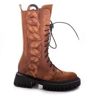 Модель с высоким голенищем, украшенным фактурным узором в виде звеньев цепи, одно из которых "выходит" за пределы края голенища.