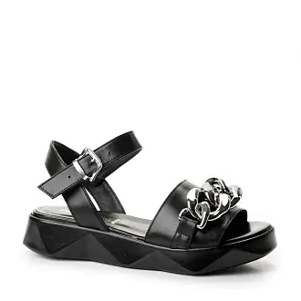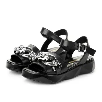 Обувь изготовлена из комбинированной кожи черного цвета и декорирована массивной цепью.