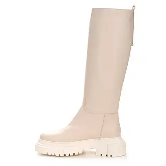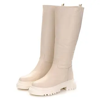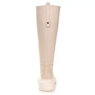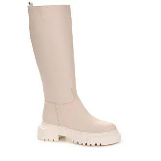 "Модные сапоги из натуральной кожи бежевого цвета позволят создать элегантный осенний образ. Модель без застежек: свободно надевать сапоги позволяет мягкое голенище.