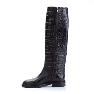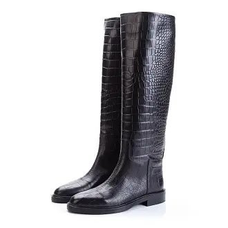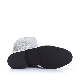 "Лаконичные сапоги из натуральной кожи под рептилию. Модель на низком комфортном каблуке с классической закругленной формой мыса.